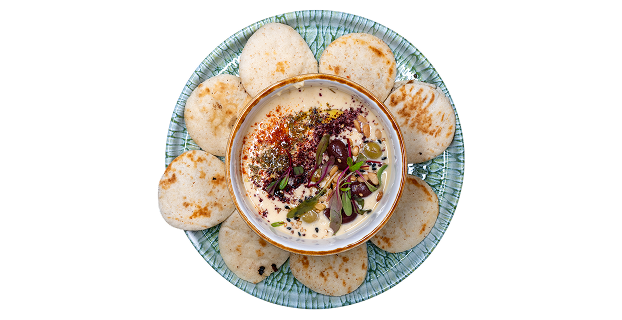 Veggies with Za’atar and EVOO, Garlic, Lemon, Mint, Smoked Paprika, Roasted Pine Nuts, Pita.
