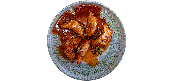 Crispy Gyoza Shell filled with Yuzu Crab Salad and Yuzu Aioli, Green Scallion, Chili Threads.